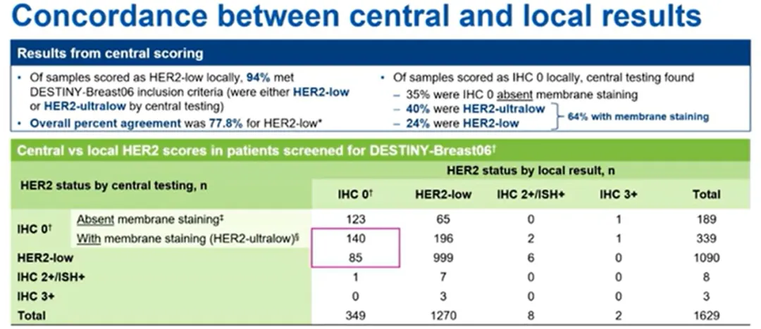 新型抗体偶联(ADC)药物T-DXd在乳腺癌领域留下了许多具有里程碑意义的“命运交响曲”,其中DESTINY-Breast 04(DB-04)和DESTINY-Breast 06(DB-06)研究分别将其拓展至HER2低表达和HER2超低表达领域,对临床治疗和病理诊断均产生深远的影响。如何更加精准地诊断出HER2低表达和超低表达乳腺癌,成为当前病理医生面临的新课题。在近日举行的2024年ESMO大会的口头报告中,DB-06研究聚焦于地方和中心病理实验室HER2检测的一致性。