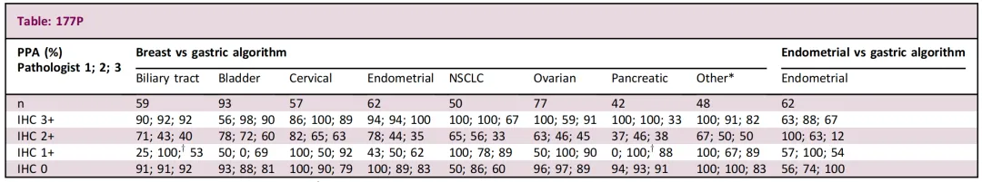 该项研究(摘要号:177P)结果显示,在IHC 3+和IHC 0的不同实体瘤中,使用ASCO/CAP乳腺癌和ASCO/CAP胃癌判断标准的一致性较高,但在IHC 1+和IHC 2+实体瘤中的一致性并没有那么理想;而子宫内膜癌临床试验的标准和ASCO/CAP胃癌标准,在判定不同HER2 IHC水平的子宫内膜癌中,一致性都欠理想。我们还需要更多的研究来探讨,到底哪一种标准更适合不同实体瘤的HER2检测和判读。