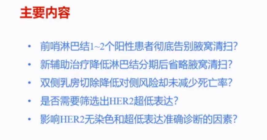 马力教授:在这次会议上,我重点介绍的是自2023年SIBCS会议结束后(2023年12月)至今,乳腺外科、病理领域的进展,其中也包含一些具有争议性的问题。因为发言时间只有10分钟,可能在会上讲述的不够全面。总体而言,我谈到了五个问题(见下图),其中三个涉是乳腺外科治疗方面的话题。