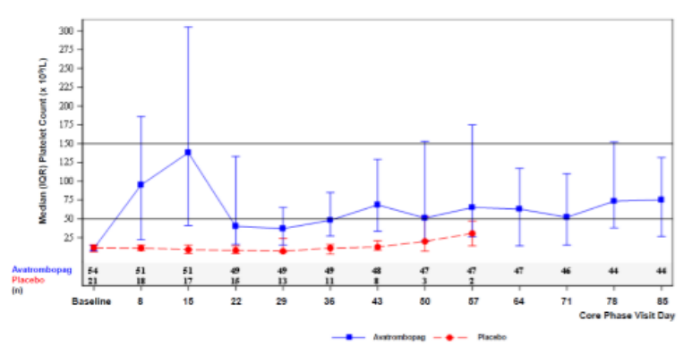 44名(81.5%)AVA受试者和1名(4.8%)PBO受试者完成了12周的核心期试验。15名(28%)AVA受试者和0名PBO受试者在第5~12周观察到了持久的血小板反应(P=0.0077,95%CI:15.8~39.7)。在44名(81.5%)AVA受试者和0名PBO受试者中观察到连续两次PC≥50×109/L(P≤0.0001,95%CI:71.1~91.8)。在30名(56%)AVA受试者和0名PBO受试者中观察到第8天血小板反应≥50×109/L(P≤0.0001),4名(7%)AVA受试者和9名(43%)PBO受试者使用了抢救治疗(P=0.0008)。