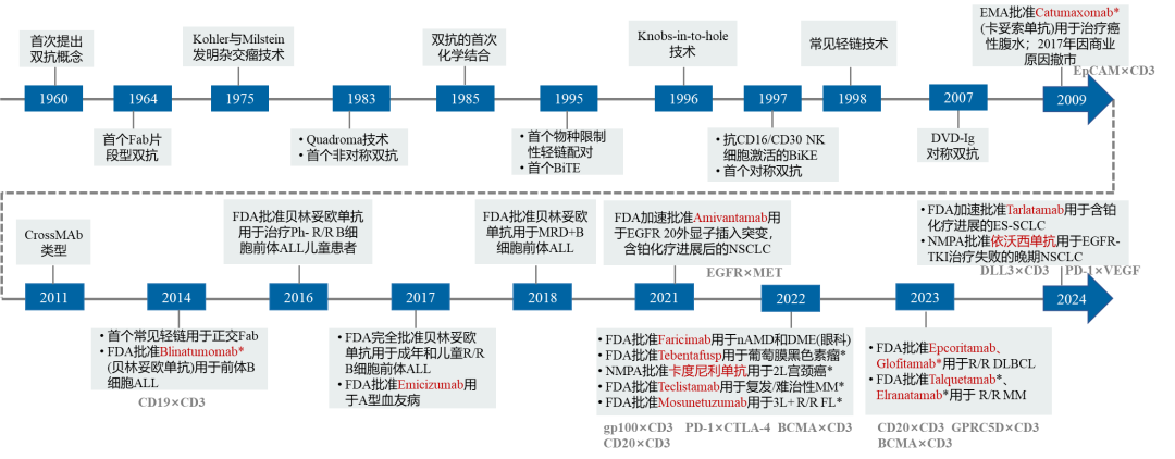 自1960年概念提出,历经技术演进,截至2024.10,NMPA/FDA已批准12个双抗上市用于肿瘤治疗,其中7个用于血液肿瘤治疗,5个用于实体瘤治疗,5个正申请上市;全球范围内超过470个双抗进入临床开发,超过1000个双抗处于临床前研究阶段。