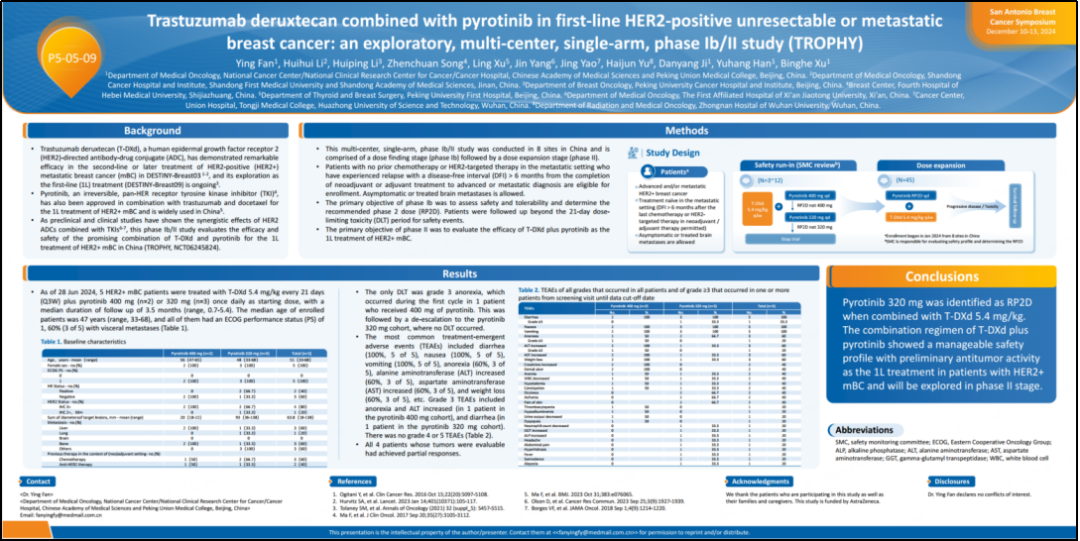 [1]Ying Fan,Huihui Li,Huiping Li,et al.Trastuzumab deruxtecan combined with pyrotinib in first-line HER2-positive unresectable or metastatic breast cancer:an exploratory,multi-center,single-arm,phase Ib/II study(TROPHY).2024 SABCS.Poster P5-05-09.