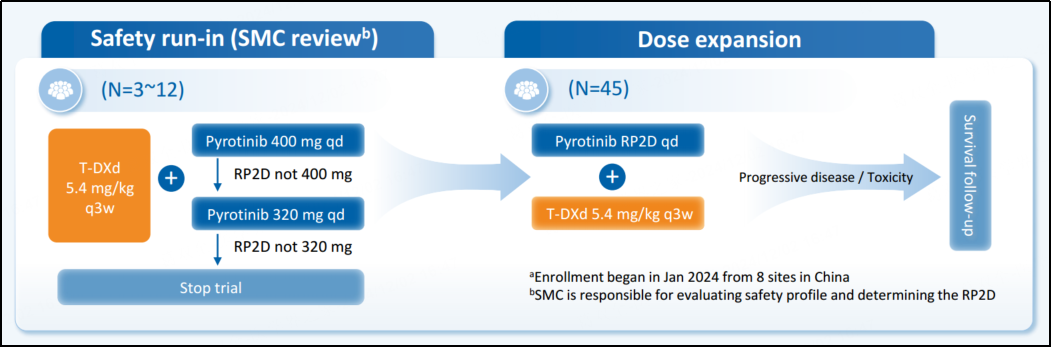 TROPHY研究是一项在中国8个中心进行的多中心、单臂II期研究,包含剂量探索阶段(I期)和剂量扩展阶段(II期)。入组条件为在转移疾病阶段未接受过任何化疗或HER2靶向治疗,并且从新辅助或辅助治疗完成至晚期或转移性诊断之间病情无进展(DFI)超过6个月的复发患者,且允许无症状或已治疗的脑转移。I期的主要目标是评估安全性和耐受性,并确定RP2D。在21天的剂量限制性毒性(DLT)观察期过后,继续随访患者以记录安全事件。II期主要目标是评估T-DXd与吡咯替尼联合作为HER2阳性转移性乳腺癌一线治疗的疗效。