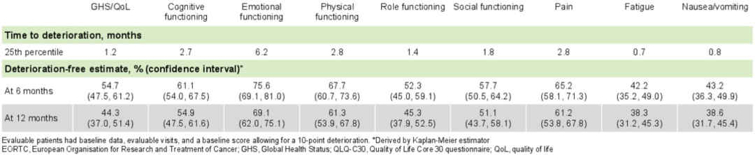 图2.非脑转移队列EORTC QLQ C-30各项评分的四分之一分位TTD、6个月/12个月无临床意义恶化率