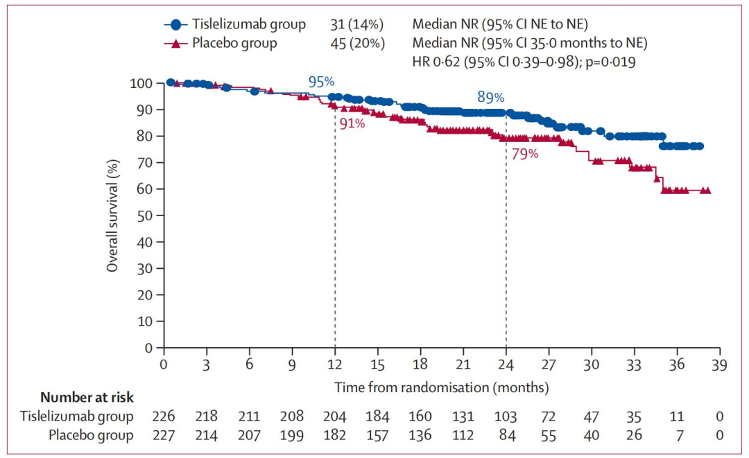从KEYNOTE-671研究的OS数据看,围手术期的免疫治疗在统计学上改善了患者的OS数据,但需要注意的是,在本次数据公布时,两组存在大量的删失数据,经过更长时间的随访后,OS的获益能否持续值得关注。同时,《柳叶刀·呼吸医学》几乎同时公布了另一款国产PD-1——替雷利珠单抗,围手术期治疗非小细胞肺癌的疗效及安全性数据,有望为国内患者带来新的选择。