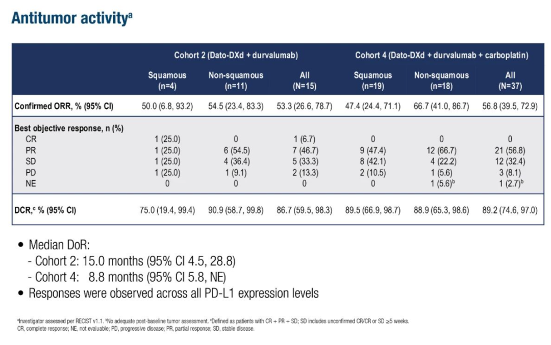 这项结果来自对TROPION-Lung04两个治疗队列的更新分析:队列2(n=15)接受Dato-DXd+度伐利尤单抗(不含卡铂),队列4(n=37)接受Dato-DXd+度伐利尤单抗+卡铂。