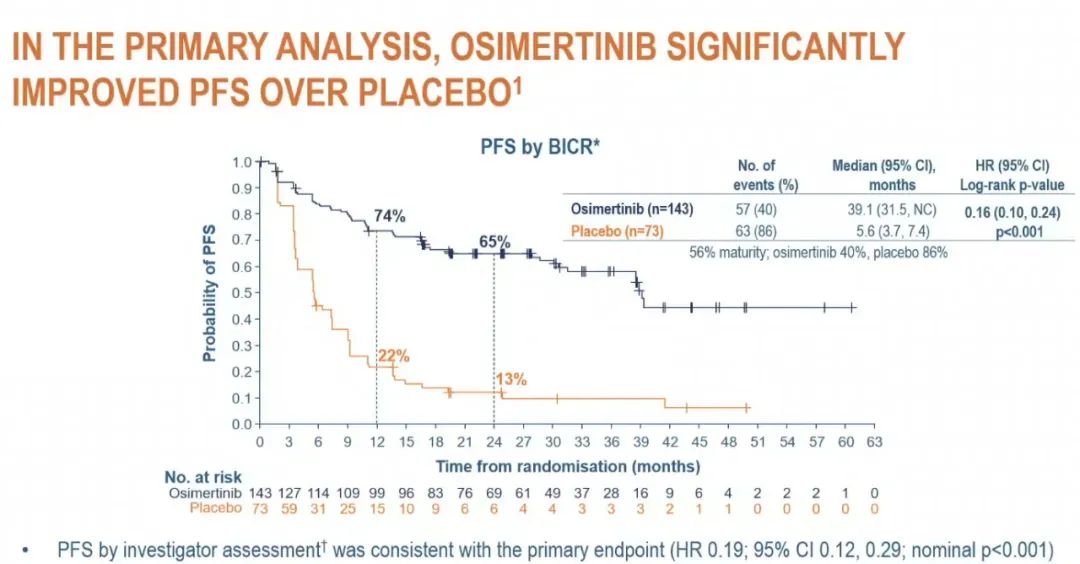 截至2024年11月29日,奥希替尼组(n=143)与安慰剂组(n=73)的中位随访时间分别为39.2个月和36.5个月。奥希替尼组的中位OS为58.8个月(95%CI 54.1-NC),安慰剂组为54.0个月(95%CI 42.1-NC),风险比(HR)为0.67(95%CI 0.40-1.14;p=0.15)。尽管OS未达到统计学显著性(预设α=0.05),但较中期分析(HR=0.81;p=0.53)呈现改善趋势,奥希替尼组在36个月后的生存优势逐渐显现。