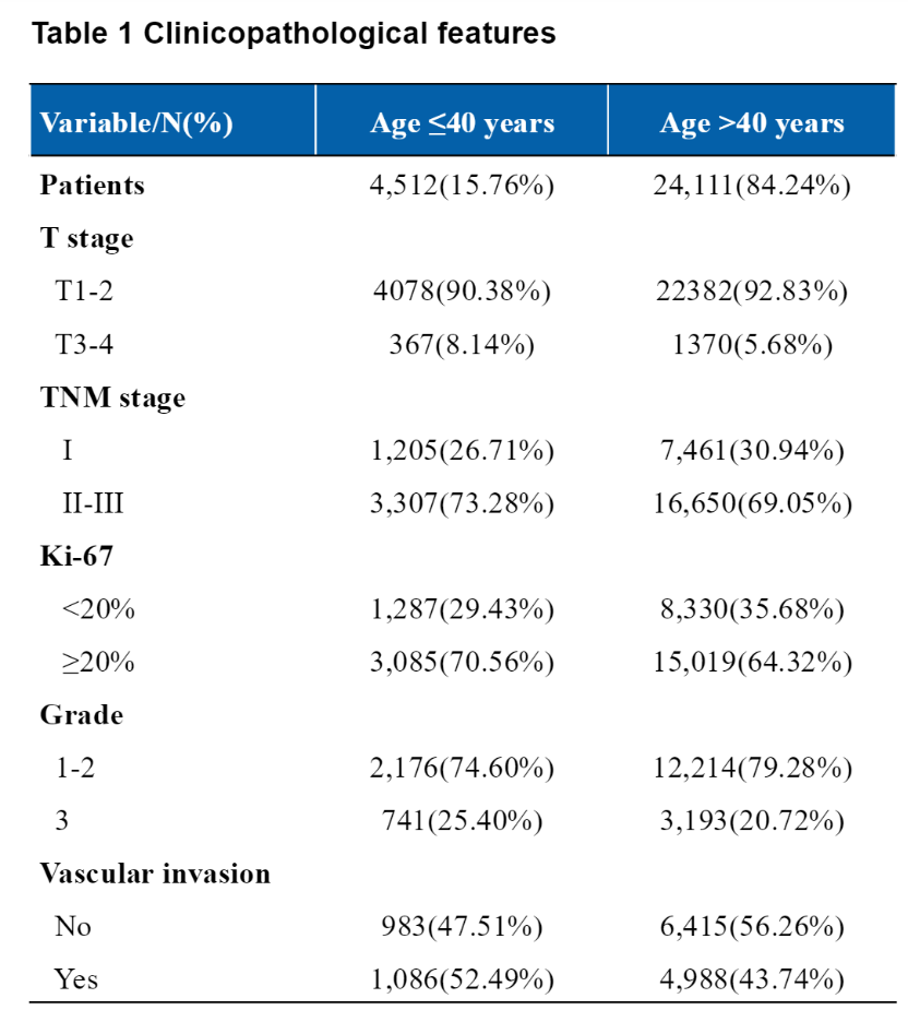 在该研究中,与>40岁的患者相比,≤40岁的患者II-III期疾病比例更高(73.28%vs.69.05%)、肿瘤分级为3级患者比例更高(25.4%vs.20.72%)、Ki-67≥20%的患者更多(70.56%vs.64.32%)、伴有淋巴血管浸润的患者更多(52.49%vs.43.74%)。