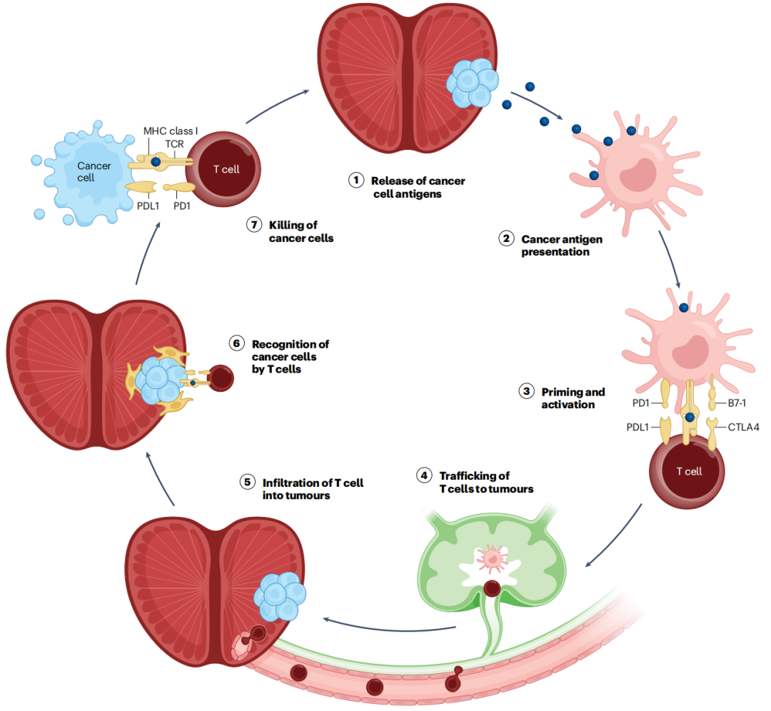 图2.癌症-免疫循环与前列腺癌中免疫细胞激活和向肿瘤微环境的转移有关,该循环中的免疫细胞的启动和激活,发生在淋巴结内(配体与其受体之间的相互作用,如B7与CTLA4)之间可以发),而其他步骤(如杀死癌细胞)则发生在肿瘤微环境中。(图源:参考文献[1])