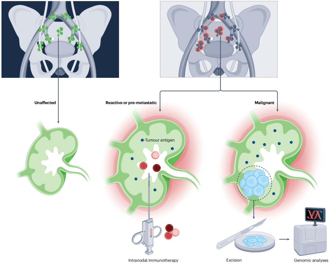 图3.盆腔淋巴结分类的新方法。前列腺癌患者可能存在的三种不同类别的淋巴结:未受影响的、反应性或前转移的和恶性的淋巴结。如果前两类能够通过新型成像技术在术前可靠地区分开,则可推测这些淋巴结可以保留,并作为未来免疫治疗努力中所需的免疫细胞的可利用储备。例如,可以在手术时在临床试验中尝试进行淋巴结内检查点抑制剂的给药(图源:参考文献[1])