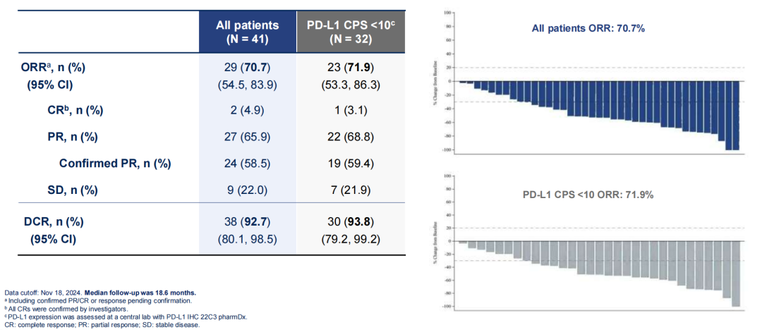 截至2024年11月18日,共纳入41例患者,中位年龄55岁;43.9%的患者ECOG PS评分为1;78.0%的患者PD-L1 CPS<10;61.0%的患者基线存在内脏转移,29.3%的患者有新发转移,19.5%的患者DFI为6-12个月(月),51.2%的患者DFI>12个月。