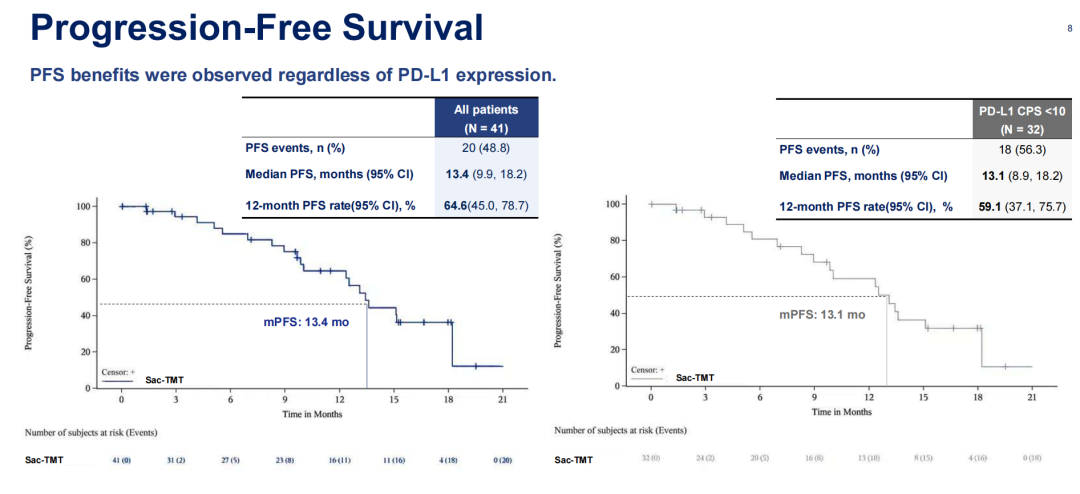 在32例PD-L1 CPS<10的患者中,ORR为71.9%(23/32,3例为未确认的PR),DCR为93.8%,中位PFS为13.1个月,12个月PFS率为59.1%(95%CI:37.1%~75.7%)。