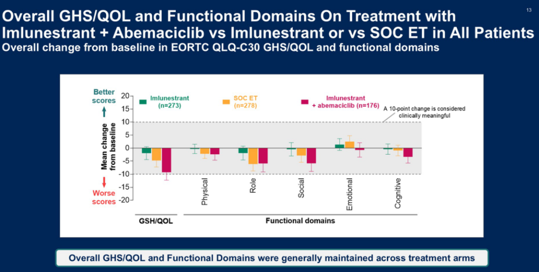 在总体人群中,imlunestrant组与标准治疗组在整体健康状况/生活质量评分方面下降幅度相似(平均变化差异:0.5[-4.7,5.7]),身体功能评分在imlunestrant组保持稳定,而标准治疗组略有下降(平均变化差异:2.5[-1.1,6.1])。