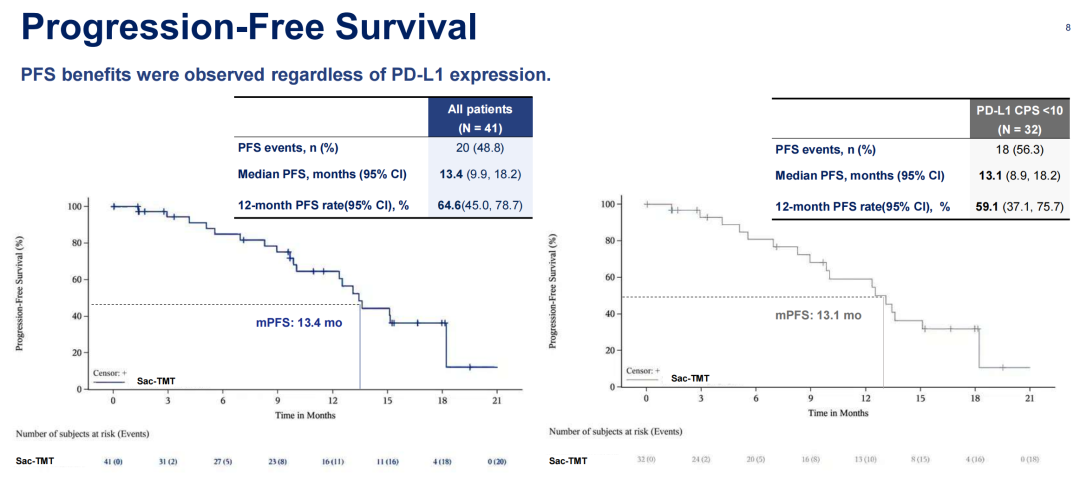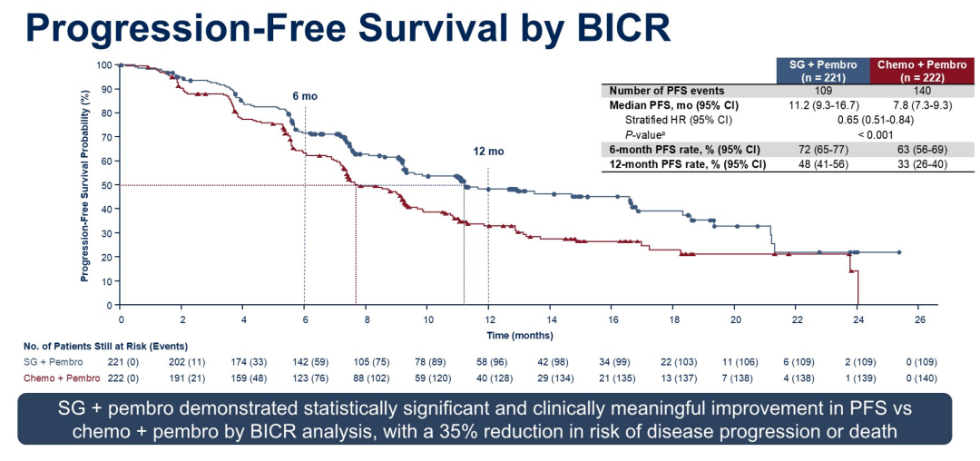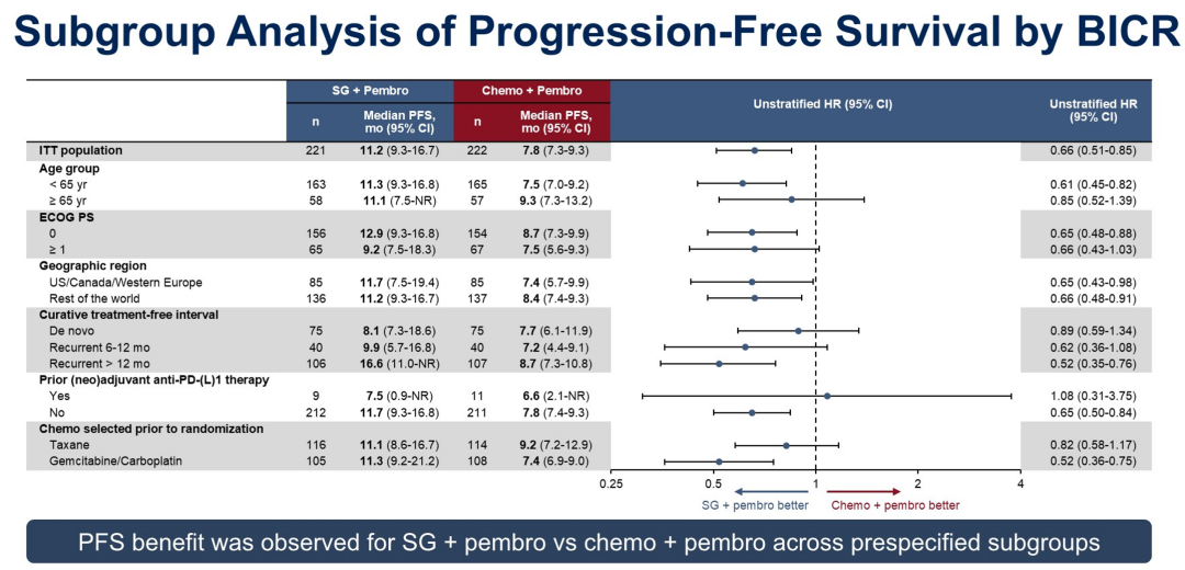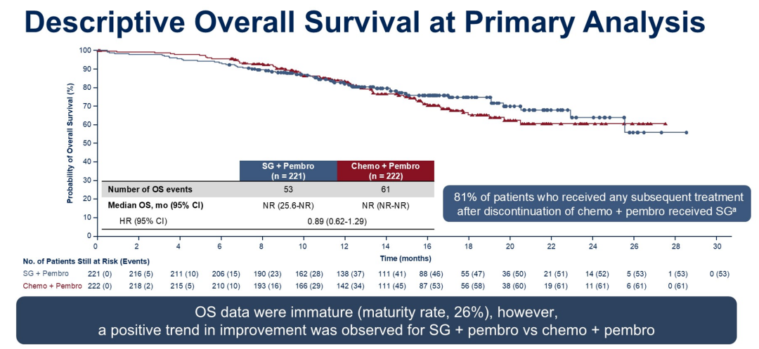 ASCENT-04研究显示达到了主要终点,独立评审委员会(BIRC)评估的中位无进展生存期(PFS)达到11.2个月,相较于对照组的7.8个月有显著延长,疾病进展或死亡风险降低35%(HR 0.65,95%CI:0.51-0.84,P<0.001)。不同亚组获益趋势一致,尤其是辅助经治患者的获益程度非常好,6-12个月复发和和>12个月复发患者HR分别为0.62和0.52。表明SG联合免疫对此类化疗不敏感的患者有很好的治疗效果。OS尚未成熟(成熟度26%),但已显示一定的获益趋势。
