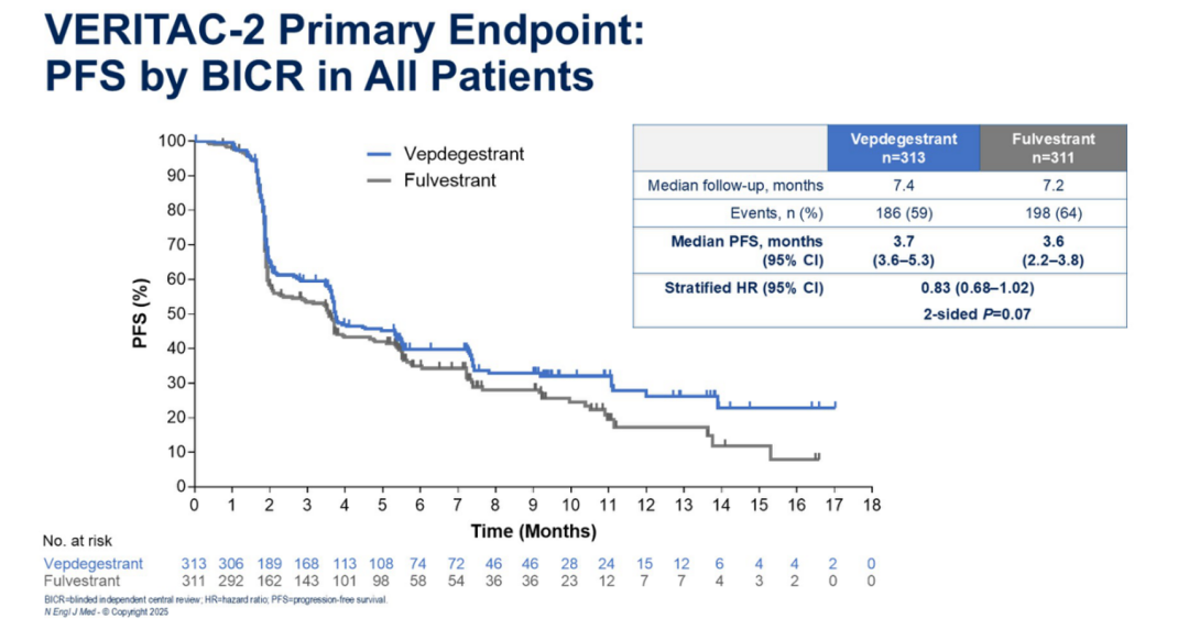 新的治疗药物:本次大会公布了VERITAC-2的临床研究结果。其中,Vepdegestrant是首个基于PROTAC技术设计的口服雌激素受体降解剂(SERD)。虽然该研究中总体人群未达到统计学显著获益,但在主要终点ESR1突变的人群中却看到了统计学差异,这一点至关重要。目前该药物已申报上市,未来有可能改变ESR1突变患者的治疗格局。