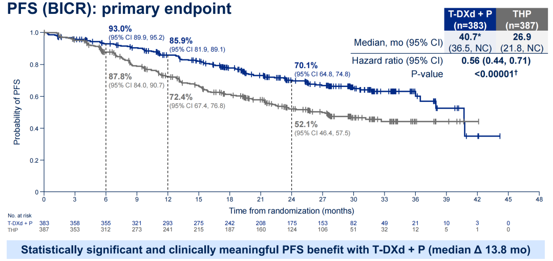 欧阳取长教授:DB-09是继CLEOPATRA、PHILA研究之后,第三个在HER2+mBC领域获得阳性结果的III期临床研究。与CLEOPATRA研究中传统的多西他赛联合曲帕双靶方案(THP)相比,DB-09研究中由独立盲态评审中心(BICR)或研究者评估的中位无进展生存期(PFS),T-DXd联合帕妥珠单抗(T-DXd+P)组都达到了40.7个月,刷新了HER2阳性转移性乳腺癌一线治疗的纪录。相较于THP组(BICR:26.9个月),T-DXd+P组的中位PFS则延长了13.8个月,疾病进展或死亡风险显著降低44%(HR 0.56,95%CI:0.44-0.71)。无论是总体的PFS长度还是PFS延长的绝对获益,T-DXd+P都展现了令人惊艳的数据。