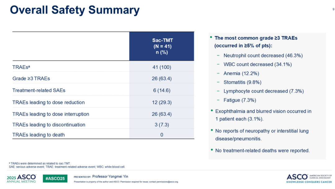 另一个重要研究是江苏省人民医院殷咏梅教授在ASCO大会口头报告的TROP2 ADC芦康沙妥珠单抗作为不可切除局部晚期/转移性三阴性乳腺癌一线治疗的单臂、II期OptiTROP-Breast05研究。该研究入组41例患者,中位随访18.6个月,结果显示总体ORR为70.7%,DCR为92.7%,中位PFS为13.4个月。特别值得注意的是,在PD-L1 CPS<10的患者中,ORR仍达71.9%,mPFS为13.1个月。安全性方面未观察到治疗相关死亡、神经毒性或间质性肺病。