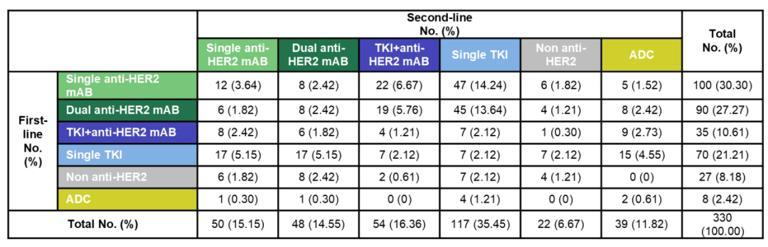 图2展示了从一线到二线的抗HER2治疗转换模式。在mAB单靶或双靶治疗后,最常用的治疗药物是TKI;而TKI治疗后,最常用的治疗药物是mAB单靶或双靶治疗、ADC。