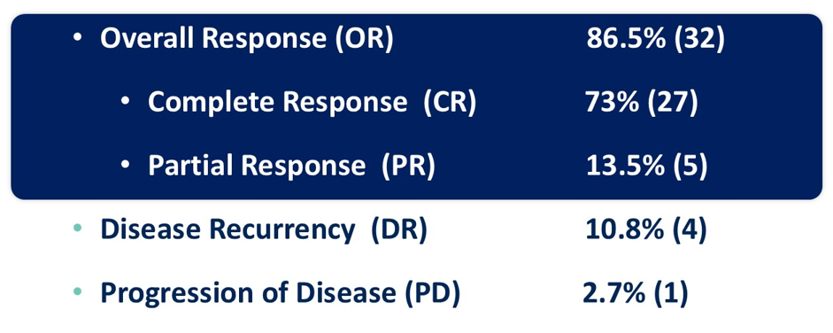 期中分析在研究方案中定义,并在研究中途(50%的可评估患者)进行,截止日期为2024年11月5日。完全缓解率(CR)73%,部分缓解率(PR)13.5%,疾病复发率10.8%,疾病进展率2.7%,总缓解率为86.5%。