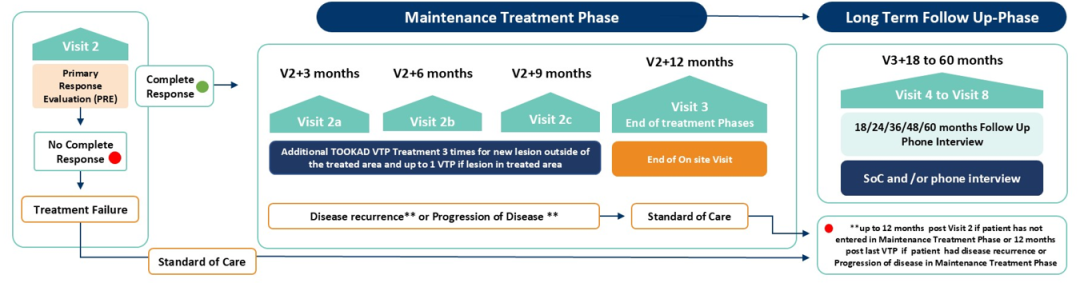VTP在麻醉和弱光条件下进行,静脉注射Padeliporfin,并通过内镜将一根20-40 mm扩散器的光纤放置在肿瘤附近。注射Padeliporfin后,激光激活10分钟。患者治疗分为两个阶段:诱导治疗和维持治疗阶段。诱导治疗包括每4周进行1-3次VTP,直到在主要反应评估随访中达到完全缓解(CR)或治疗失败。主要终点是诱导治疗期间内镜评估时的CR和主要反应评估时(最后一次治疗后28±3天)细胞学检查阴性结果。达到CR的患者将进入维持治疗阶段,每3个月进行一次内镜评估,在长达12个月的时间内对复发性肿瘤进行VTP。完成维持治疗的患者将额外随访48个月,以评估长期疗效。共入组100名患者。