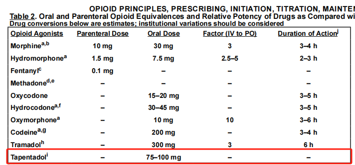 阿片类药物轮换可提高镇痛效果和患者满意度,但需根据患者实际情况进行选择和调整剂量。国外多项研究[5-7]显示如可待因诱发呼吸抑制患者、羟考酮过敏患者、吗啡等阿片类药物不良反应不耐受患者,均可选择他喷他多进行轮换。NCCN成人癌痛指南[8]推荐他喷他多可用于癌痛治疗的阿片药物轮换,即释制剂他喷他多最大日剂量为600mg。
