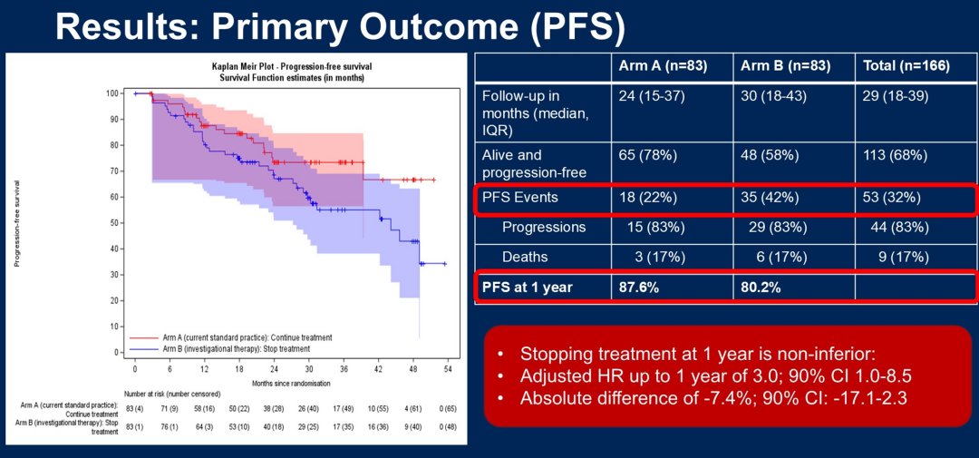 在免疫治疗时代,优化晚期黑色素瘤患者抗PD-1单抗的治疗时长仍是临床关注的重点。2025年ASCO大会报道的III期DANTE研究探索了这一问题,该研究将一线免疫治疗(PD-1单抗或PD-1/CTLA-4双免)有效达1年的晚期黑色素瘤患者随机分为继续治疗至2年组(A组)或停药组(B组)。初步分析显示停药组1年PFS率不如持续治疗组(80.2%vs 87.6%),两组ORR均为65%,但持续治疗组CR率更高(53%vs 45%)。因此2年标准疗程仍为推荐治疗时长。