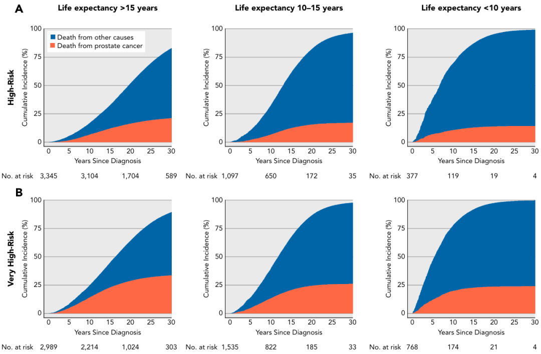根据现行NCCN指南接受初始治疗的非转移性前列腺癌男性,死于其他原因的可能性比死于癌症的可能性高出6倍。预期寿命较长的男性,即使是高危患者,死于其他原因的可能性也是死于前列腺癌的两倍。研究人员对确诊后长达30年的前列腺癌特异性死亡率和其他原因死亡率的估计,为现代治疗的疗效提供了切合实际且较高的预期,可以作为临床疗效报告的基准。