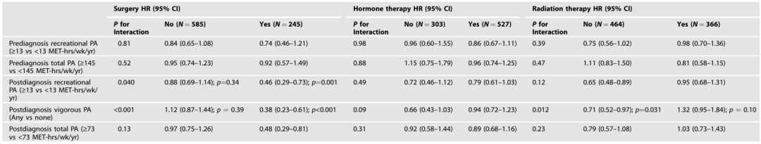 诊断前总体力活动与内分泌治疗存在统计学上边缘显著的相互作用(P=0.049),未发现其他显著关联。