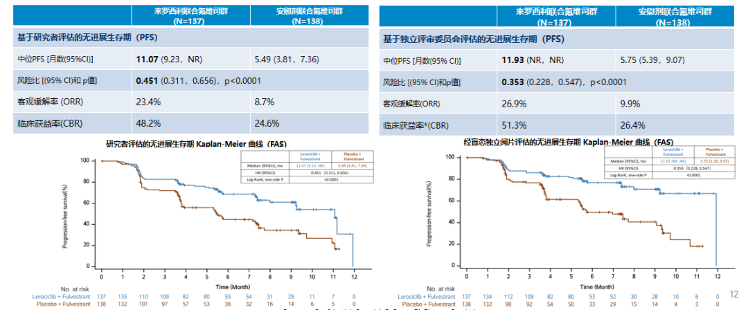 来罗西利联合氟维司群治疗延长患者mPFS至11.07个月,显著优于安慰剂组的5.49个月(HR 0.451,P<0.001)降低疾病进展或死亡风险55%。针对高危难治人群如“转移部位数目>3,复发转移期接受过化疗”等患者,来罗西利联合氟维司群治疗的临床获益率更高[5]