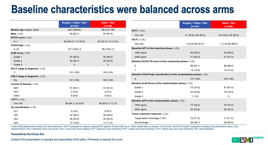 TALENTOP研究是一项多中心、开放标签、随机III期临床研究(NCT04649489),由复旦大学附属中山医院樊嘉院士领衔,在全国24家临床中心联合开展。它创新性地聚焦于“经系统治疗后获得疾病控制的局部晚期HCC患者”这一特殊群体,比较了经阿替利珠单抗+贝伐珠单抗初步治疗后获得部分缓解(PR)或疾病稳定(SD)的晚期HCC患者,接受肝切除术+维持治疗的有效性和安全性。