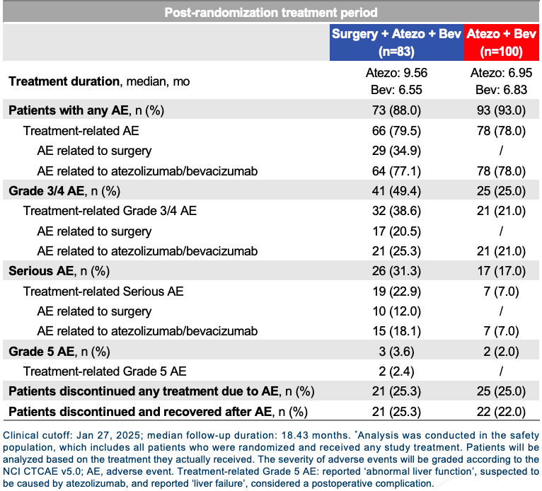 安全性上,阿替利珠单抗+贝伐珠单抗治疗毒性无特殊情况。A组治疗相关≥3级不良事件发生率为27.7%,B组为21.0%(表2)。手术相关≥3级并发症发生率21.7%,但总体风险在可控范围。