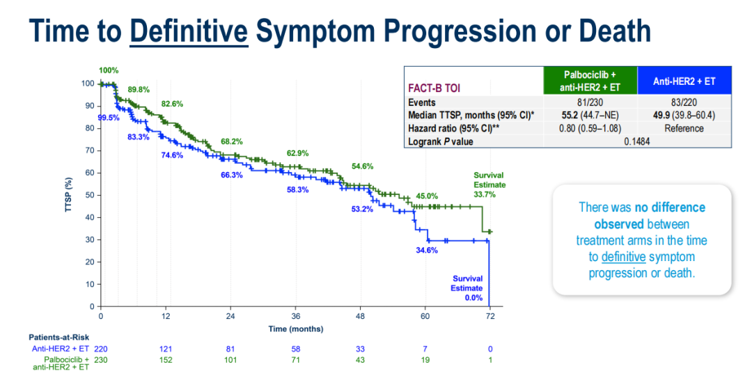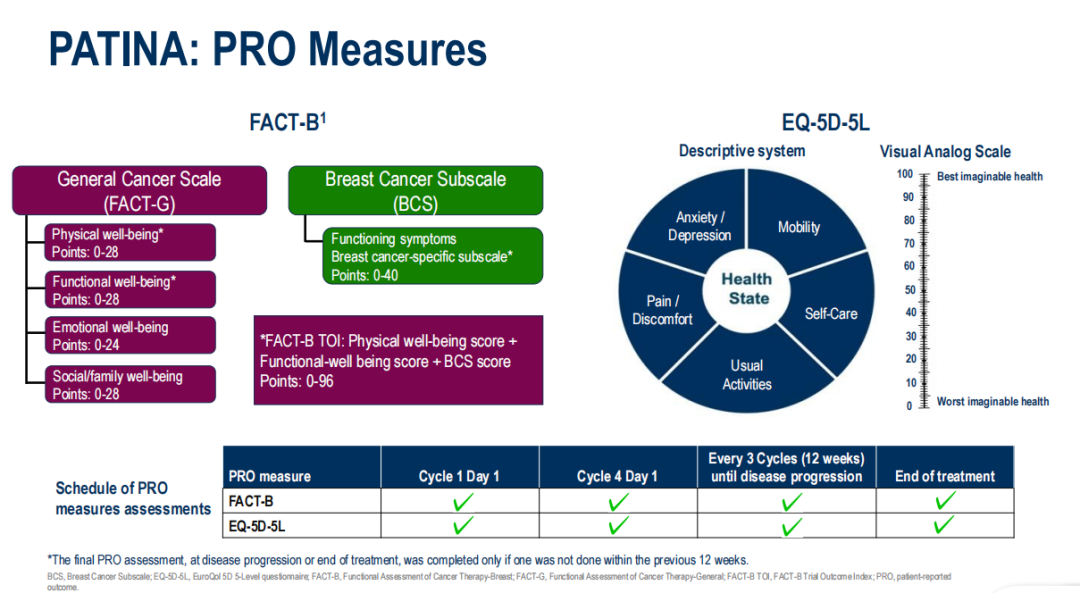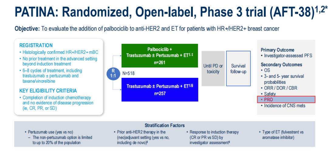 III期PATINA试验(AFT-38;NCT02947685)评估了在HR+/HER2+转移性乳腺癌患者接受基于HER2的化疗后,在维持期HER2靶向治疗和内分泌治疗(ET)基础上加用哌柏西利的效果。加用哌柏西利将中位无进展生存期(mPFS)改善了15.2个月(风险比HR:0.74),且毒性可控。本次报告该试验预设的HRQoL结果。