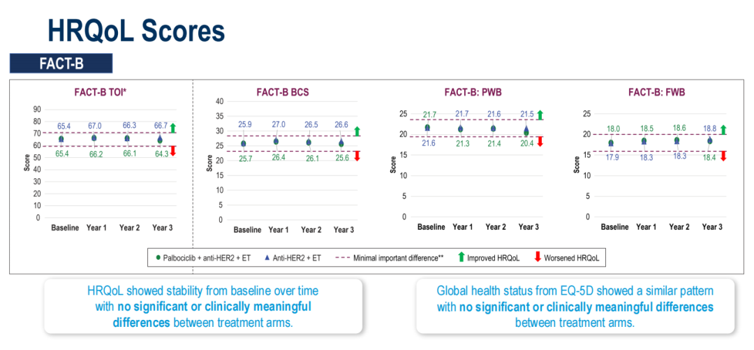 结果表明,在HER2靶向治疗和内分泌治疗基础上加用哌柏西利,能够维持患者的HRQoL,且这种效应在整个治疗期间持续存在。这些数据与疗效结果共同支持,将基于哌柏西利的治疗作为HR+/HER2+转移性乳腺癌患者一线维持治疗具有良好的临床获益-风险特征。对于预期需长期接受全身治疗(mPFS>44个月)的患者群体而言,能够维持其HRQoL具有重要的临床意义且令人鼓舞。