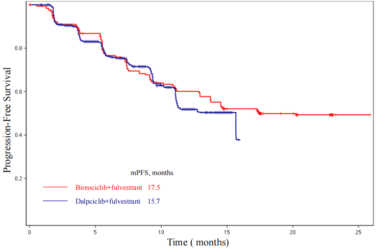 研究者评估的中位PFS显示,吡洛西利联合氟维司群为17.5个月,与达尔西利联合氟维司群(15.7个月)相比,呈现出更长的数值趋势。