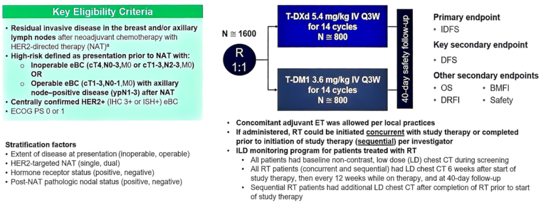 DESTINY-Breast11研究是一项全球、多中心、开放标签III期研究,旨在于高危HER2+早期乳腺癌患者中比较T-DXd单药、T-DXd-THP方案与标准ddAC-THP方案新辅助治疗的疗效。其高危标准包括:1)临床肿瘤分期≥cT3且淋巴结N0-3;2)cT0-4且N1-3;3)炎性乳腺癌。主要终点为病理完全缓解率(pCR,ypT0/Tis ypN0),次要终点包括无事件生存期(EFS)、安全性、药代动力学、免疫原性、总生存期(OS)、健康相关生活质量(HRQoL);额外结局指标为肿瘤残余负荷(RCB)。