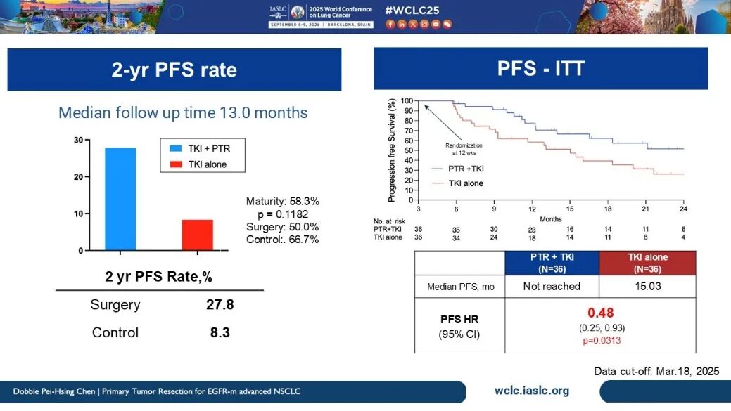 手术组中,主要病理学缓解率为29.4%,完全病理学缓解率为5.9%。两组中位PFS分别为未达到和15.03个月(HR=0.48,P=0.0313),2年PFS率分别为27.8%和8.3%。在寡转移与多发转移患者中,HR分别为0.40和0.50;在19del与21L858R突变患者中,HR分别为0.60和0.38。