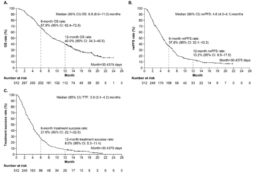 经过中位8.3个月的随访,研究获得了令人鼓舞的有效性数据。中位OS为8.9个月(95%CI:8.0-11.0),中位rwPFS为4.6个月(95%CI:4.0-5.1),中位TTF为3.9个月(95%CI:3.4-4.2)(图2)。