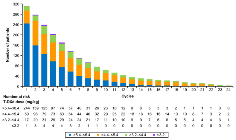 78.2%的患者初始T-DXd剂量为>5.4-≤6.4 mg/kg,16.0%接受>4.4-≤5.4 mg/kg的减量剂量。约三分之一患者(34.9%)接受<4周期治疗,29.8%接受4-7周期治疗,15.1%接受7-10周期治疗,8.7%接受10-13周期治疗,8.0%接受≥16周期治疗(图1)。