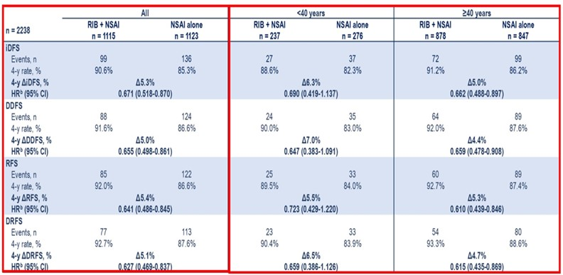 绝经前人群的年龄亚组分析显示,无论是<40岁还是≥40岁的患者,联合治疗均带来一致获益。其中,<40岁的非常年轻患者获益幅度更为突出,其4年iDFS与DDFS的绝对提升分别达到6.3%和7.0%,显示出强大的远期复发控制潜力。该方案在此类高复发风险人群中耐受性良好,停药率低,有助于维持患者生活质量[13]