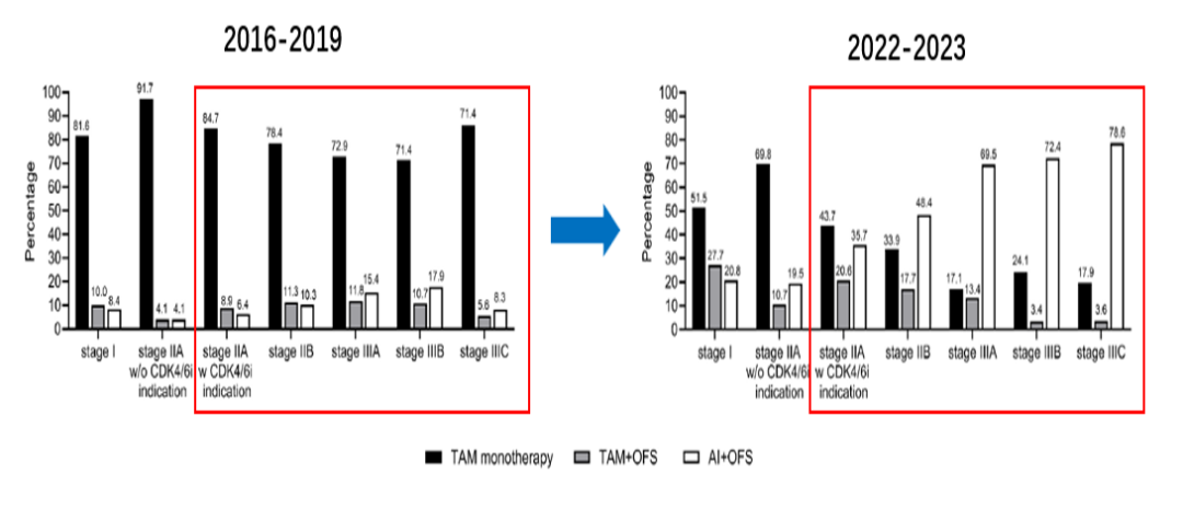 图1.CLEAR-B研究2016–2019对比2022–2023辅助内分泌治疗方案分布[8]
