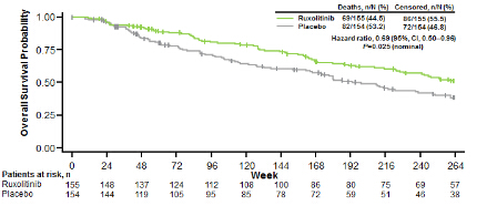 Srdan报道了RUX治疗MF和安慰剂随机对照研究(COMFORT-I)的5年随访结果。中位随访268周,155例RUX组患者中,仍有43例接受治疗,在111例由安慰剂交叉至RUX治疗的患者中,28例仍在治疗。持续RUX治疗患者平均脾脏体积缩小37.6%,18.5%的患者脾脏体积缩小超过35%,脾脏体积缩小超过35%的中位持续时间为168.3周。在总体生存(OS)方面,RUX组显著优于安慰剂组(HR=0.69,95%CI:0.50~0.96,P=0.025),RUX组中位OS尚未达到(见图1)。Hb和PLT水平在RUX治疗24周后持续稳定。长期使用RUX的安全性与既往临床试验报道结果一致。