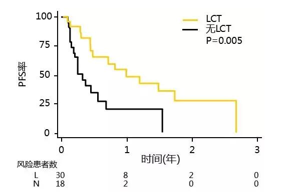 手术治疗肺癌寡转移的前瞻性研究2:在这项研究中,两组在性别、年龄、种族、组织学分类或其他因素上无统计学差异(P>0.05)。主要终点是PFS,1例患者无法评估(每组24人)。中位PFS:LCT 组为11.9个月(95%CI 5.4个月-NA),无LCT组为3.9个月(95% CI 2.2个月-6.6个月)。