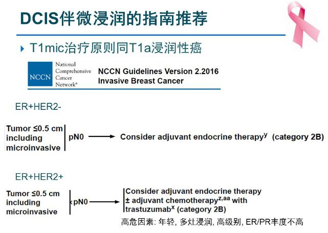 NCCN指南推荐T1mic的治疗原则基本等同T1a浸润性癌。对于ER阳性HER2阴性的患者,只考虑辅助内分泌治疗即可,对于ER阳性HER阳性的乳腺癌患者,还需要考虑化疗及HER2靶向治疗,但在什么情况下去考虑可能更多依赖于医生的个人经验。个人认为,对于存在高危因素的患者如年轻、多灶浸润、高级别、ER/PR丰度不高等患者,可能要更积极地考虑进行化疗及抗HER2靶向治疗。