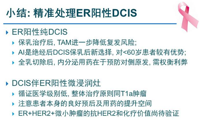 综上,对于ER阳性纯DCIS,保乳治疗后,他莫昔芬可进一步降低复发风险;芳香化酶抑制剂是绝经后DCIS保乳后的新选择,对于<60岁的患者较有优势;全乳切除后,内分泌用药的价值主要在于预防对侧第二原发,需权衡利弊后用药。对于DCIS伴ER阳性的微浸润灶,由于循证医学级别低,治疗原则与T1a肿瘤相同,需要注意患者本身的良好预后及用药是否有提升空间,而ER阳性HER2阳性的微小肿瘤,它的抗HER2治疗和化疗的价值尚待验证。在未来的治疗中,我们还需要开发相应的工具,来做更加精准的治疗。