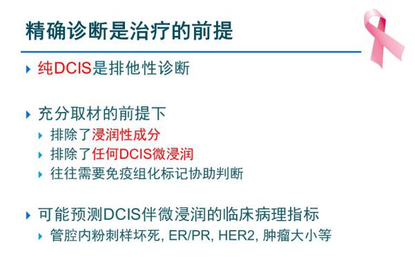 首先,精确诊断是治疗的前提,纯DCIS是排他性诊断。换言之,只有在充分取材的前提下,在所有病灶中排除了浸润性成分,排除了任何DCIS微浸润成分,纯DCIS的诊断才得以成立。当然,病理科医生往往也需要借助免疫组化标记来协助诊断。管腔内粉刺样坏死、ER/PR、HER2、肿瘤大小等指标是可能预测DCIS伴微浸润的临床病理指标。如果患者被诊断为纯粹的DCIS,还未突破基底膜,那么此时的问题则为局部问题,应行局部处理。