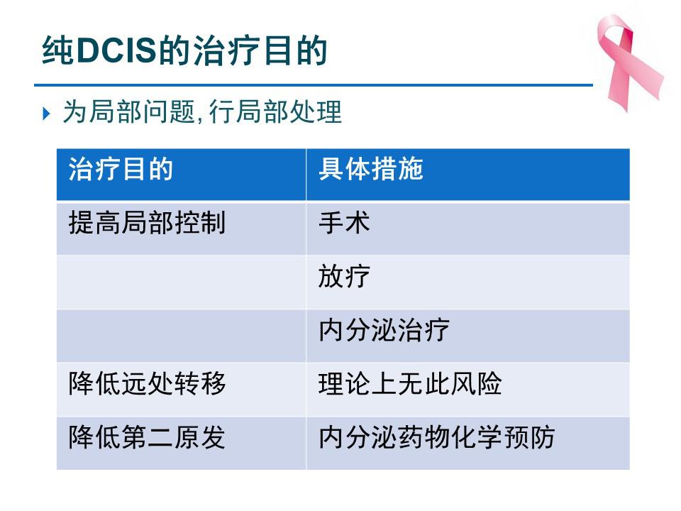 为了提高局部控制率,可以行手术、放疗和内分泌治疗。由于DCIS发生远处转移的机会较低,理论上无此风险。另外,可以应用内分泌药物化学预防来降低第二原发的发生风险。