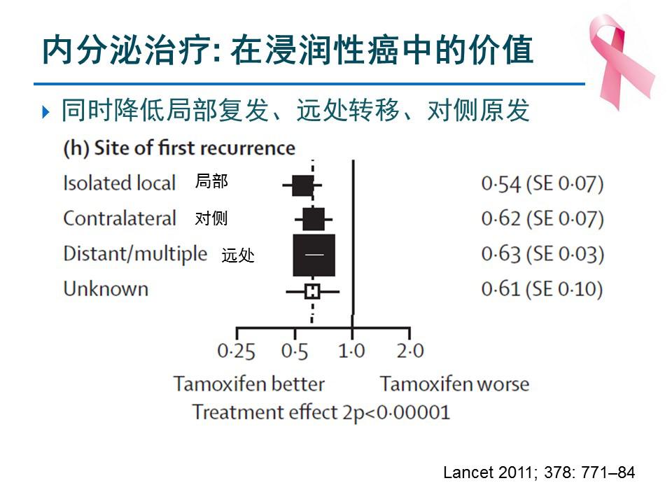 从内分泌治疗上来说,内分泌治疗对于浸润性癌的价值已经得到了肯定,可以同时降低局部复发、远处转移和对侧原发。对于纯DCIS而言,保乳术后的复发风险包括同侧乳房内复发以及对侧第二原发乳腺癌,而全乳切除后则只有发生对侧原发的风险;对于DCIS伴微浸润而言,术后的复发模式可以存在同侧复发、区域、远处转移和对侧原发。所以对于DCIS伴微浸润的治疗来说,我们可以做与浸润性癌相似的考量。