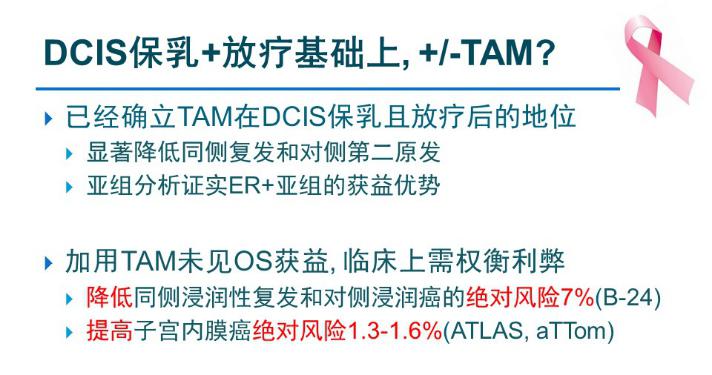 在DCIS保乳联合放疗的基础上,是否需要做内分泌治疗?包括UK/ANZ以及NSABP B-24在内的多个临床试验均证实内分泌治疗更有效。以最经典的NSABP B-24研究为例,患者接受保乳治疗后随机分为两组,一组接受放疗联合他莫昔芬治疗,另外一组接受放疗联合安慰剂,结果显示他莫昔芬可以进一步降低40%-50%的复发风险。但B-24研究在设计之初并未区分患者的ER状态,在后续的回顾性数据中,发现ER阴性的患者应用他莫昔芬并不能降低复发风险,他莫昔芬对ER阳性的患者才有效。由此,目前已确立了他莫昔芬在DCIS保乳且放疗后的地位,他莫昔芬可显著降低同侧复发和对侧第二原发。亚组分析证实了ER阳性亚组的获益优势,但加用他莫昔芬并未见OS的获益。同时,他莫昔芬虽然可降低同侧浸润性复发和对侧浸润性癌的绝对风险7%,但同样也提高了子宫内膜癌的绝对风险1.3-1.6%,因此在临床应用中需要权衡利弊。