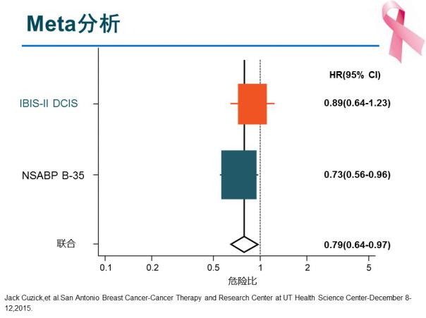 那对于绝经后的患者是否可以应用AI替代他莫昔芬?在浸润性癌领域,已有ATAC、BIG 1-98、TEAM等试验的meta分析已证实,AI较TAM有DFS/OS优势。NSABP B-35试验对行保乳术的绝经后激素受体阳性的DCIS患者随机分为两组,一组应用他莫昔芬5年,另外一组应用阿那曲唑5年。在中位随访9年后,在<60岁的患者中两组无事件率差别较大,而在年龄≥60岁的患者中两组并无显著差异,也就是说<60岁的患者比≥60岁的患者更能从阿那曲唑中获益。然而,后续研究的IBIS-II DCIS试验,虽然其试验设计与B-35试验基本相同,但无法再次验证阿那曲唑对比他莫昔芬的优势。尽管纳入这两个研究的meta分析显示阿那曲唑依然优于他莫昔芬,但在临床中我们尚不能断定哪个更好。