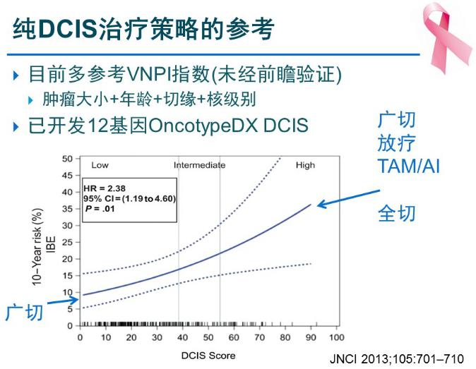 目前制定纯DCIS的治疗策略多参考VNPI指数。该模型虽然被很多中心认可,但仍未进行大规模的前瞻性验证,它主要根据肿瘤大小、年龄、切缘、核级别来评定分数,分数较低的进行广切,分数较高的进行全乳切除。利用基因工具评价DCIS的复发风险高低是未来的趋势,目前已开发12基因OncotypeDX DCIS。对于OncotypeDX DCIS评分较高的病灶,建议广切加放疗加TAM/AI甚至于全切,对于评分较低的DCIS,可建议广切。